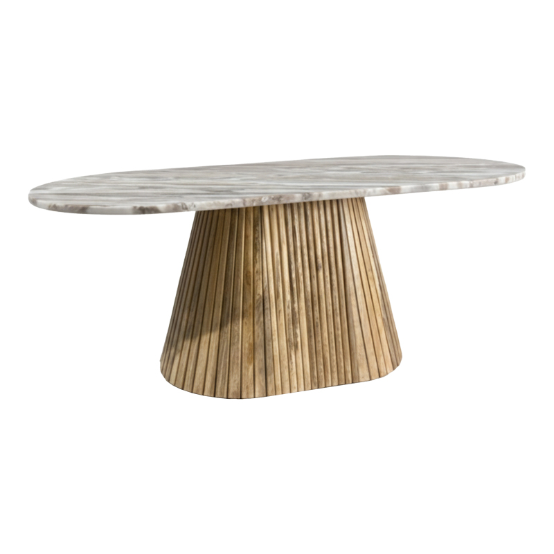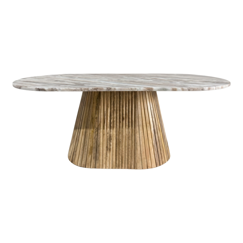 Η βαση του τραπεζιου ειναι κατασκευασμενη απο μασιφ Ξυλο Μανγκο, με ενα ιδιαιτερο χαρακτηριστικο την αναγλυφη, ραβδωτη υφη της, η οποια δημιουργει ενα εντυπωσιακο οπτικο ενδιαφερον και μια ζεστη, συγχρονη αισθηση.