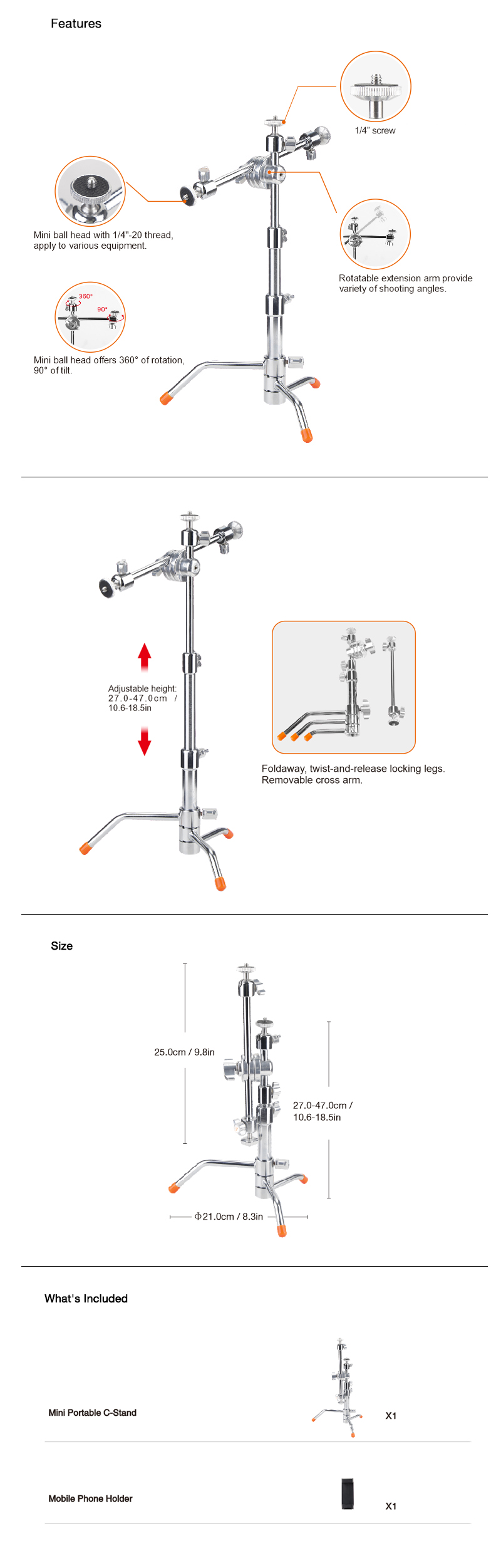 Το E-IMAGE LCS-MINI ειναι ενα compact Mini C-Stand με ρυθμιζομενο υψος απο 27 cm εως 47 cm, προσφεροντας ευελιξια σε περιορισμενους χωρους και ακριβη τοποθετηση εξοπλισμου.